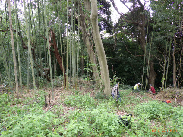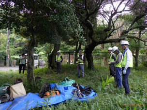 常盤山車庫周辺緑地の整備 10月23日に常盤山緑地の休憩舎(仮称)建屋へ至る階段、径路、径路の両側および建屋周辺のアズマネザサの刈取りを行いました。